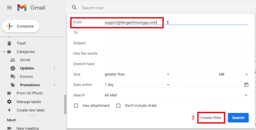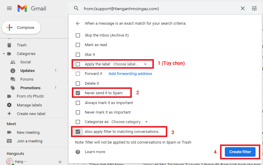 2. Bạn điền email support@tienganhmoingay.com vào dòng From (Từ), sau đó nhấn Create filter (Tạo bộ lọc) như hình bên dưới.