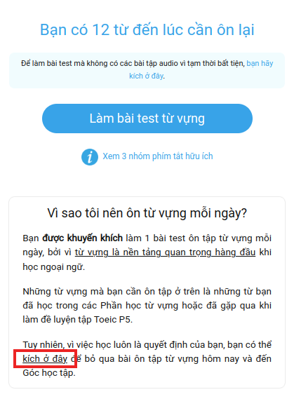 - Học từ mới ngay trong lúc làm bài luyện tập TOEIC Part 5. Xem mô tả chi tiết chương trình học từ mới.