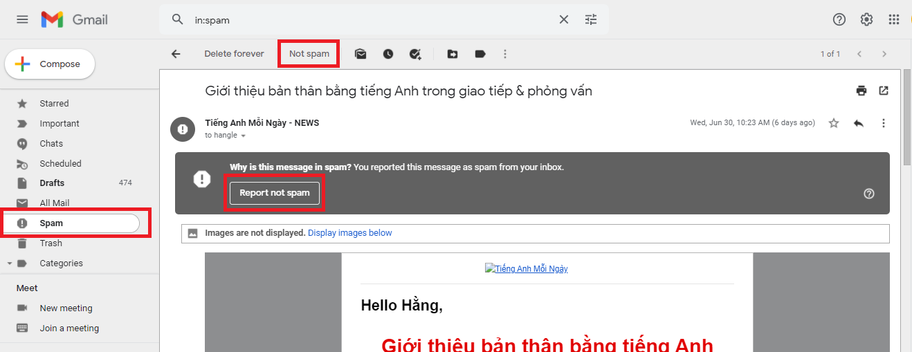 Với những email gửi từ Tiếng Anh Mỗi Ngày, bạn hãy kích vào nút Not spam hoặc Report not spam như hình minh họa dưới đây nhé.