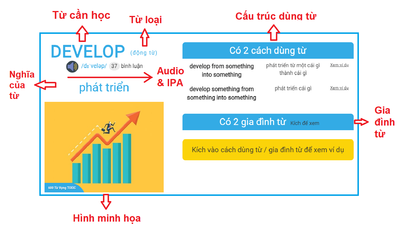 Bước 1 + Bước 2: Xem những nội dung cần học về một từ + Xem cấu trúc dùng từ và gia đình từ của nó