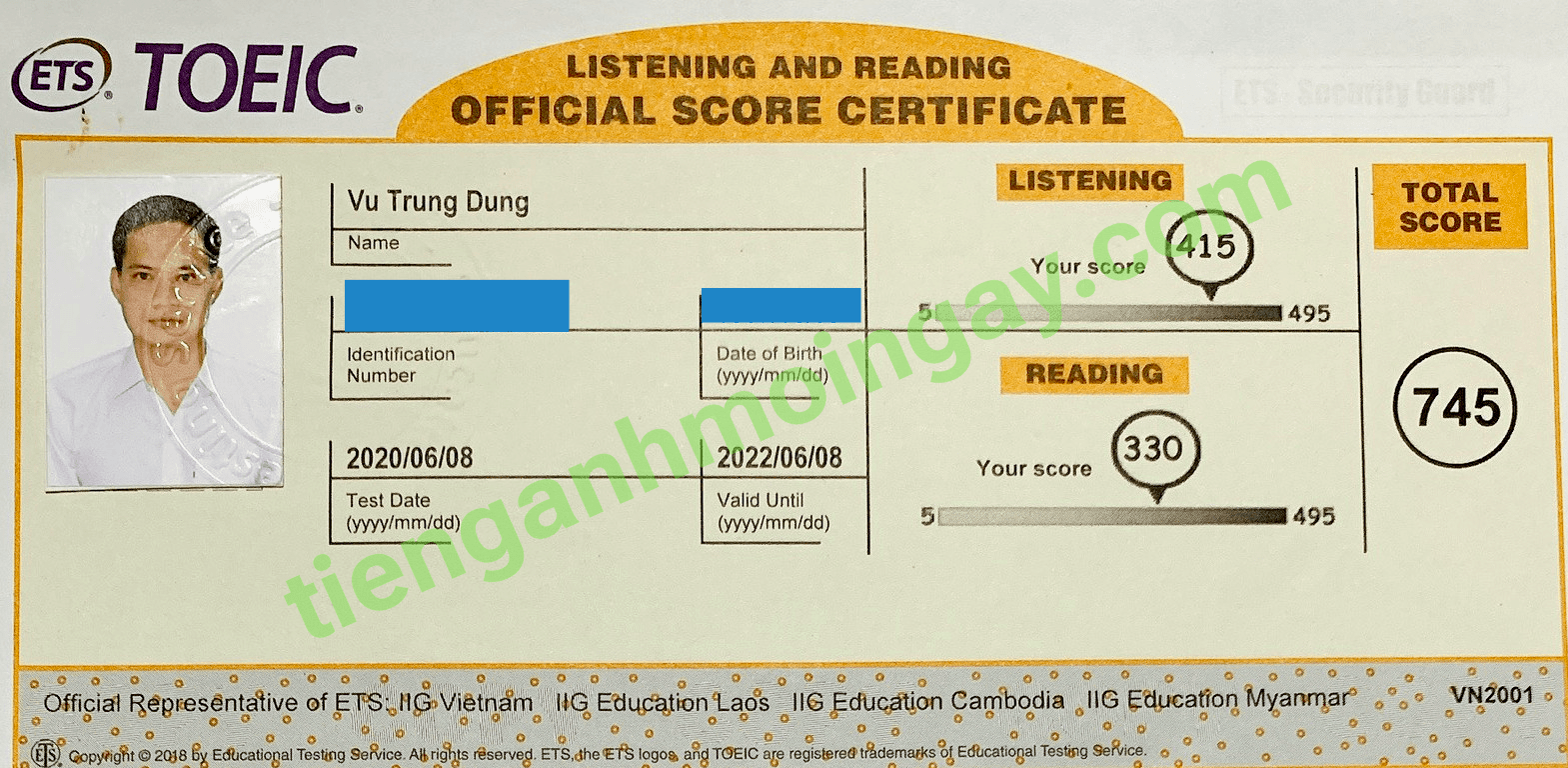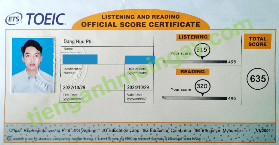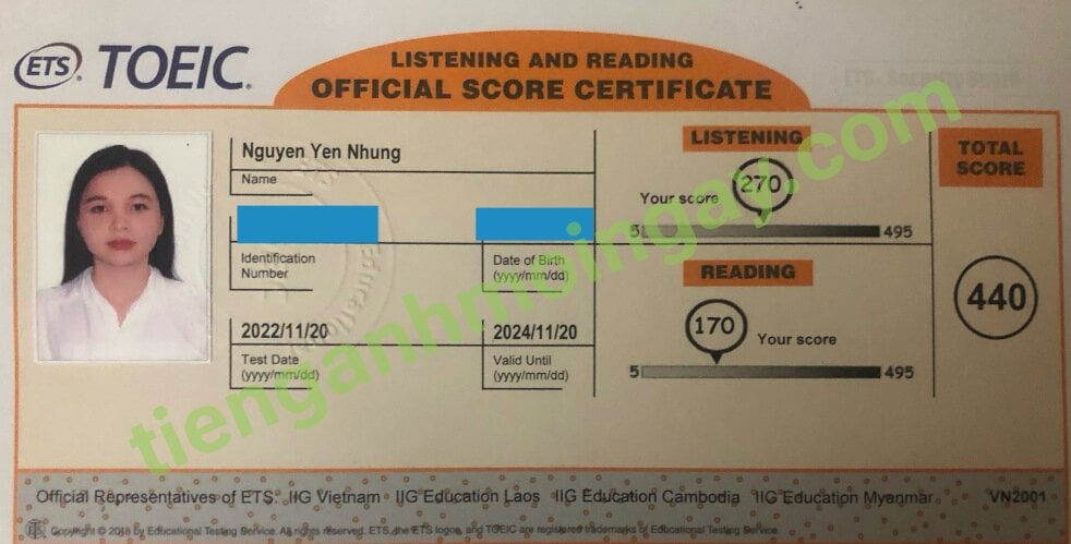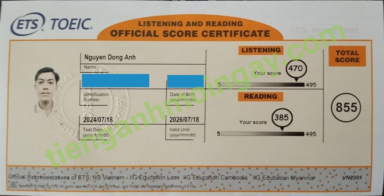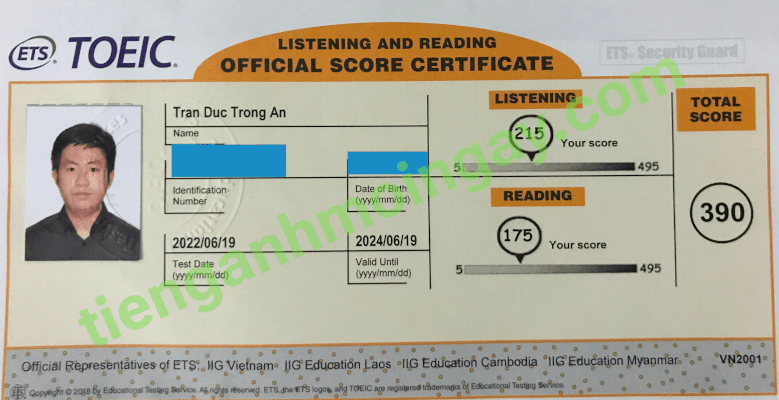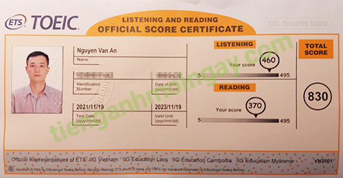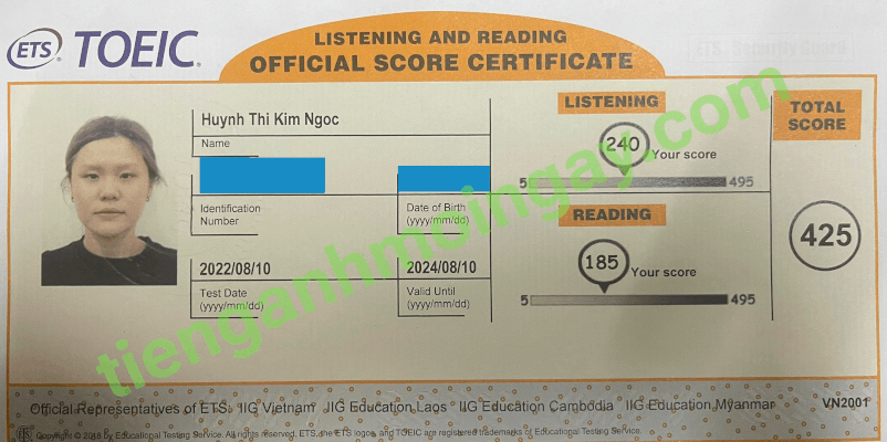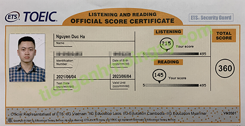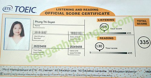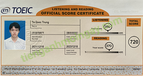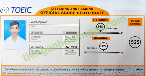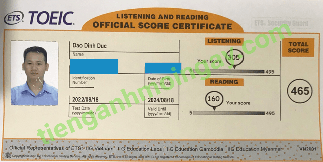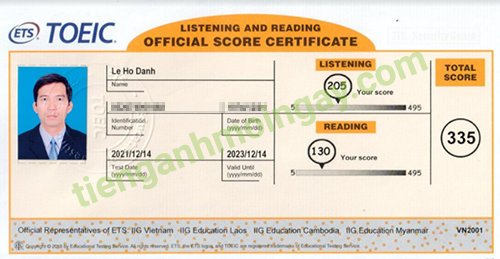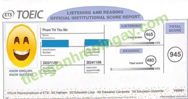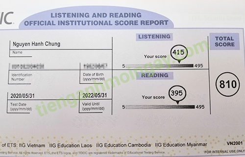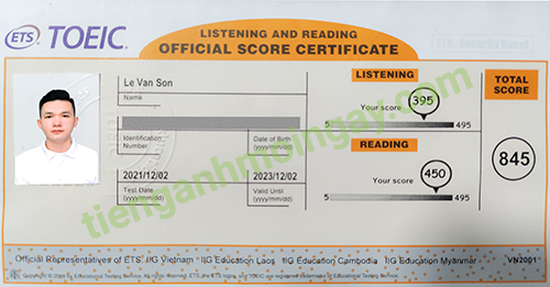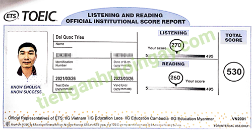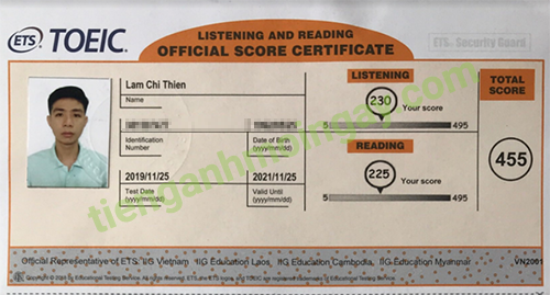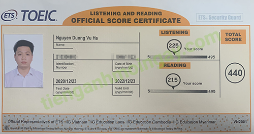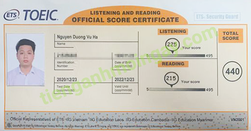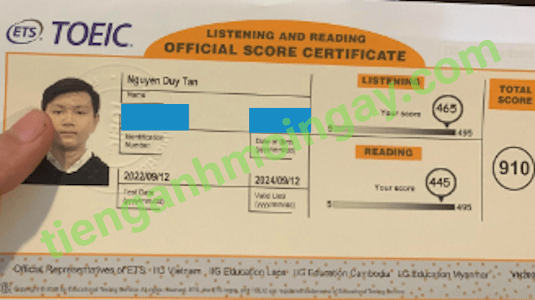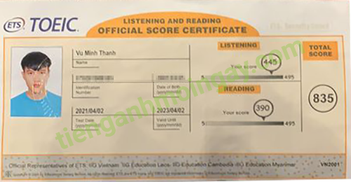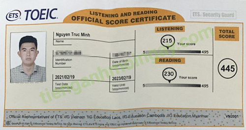 Sau thời gian 3 tháng ôn tập, bạn Minh đã đạt được 445 điểm TOEIC thật.
