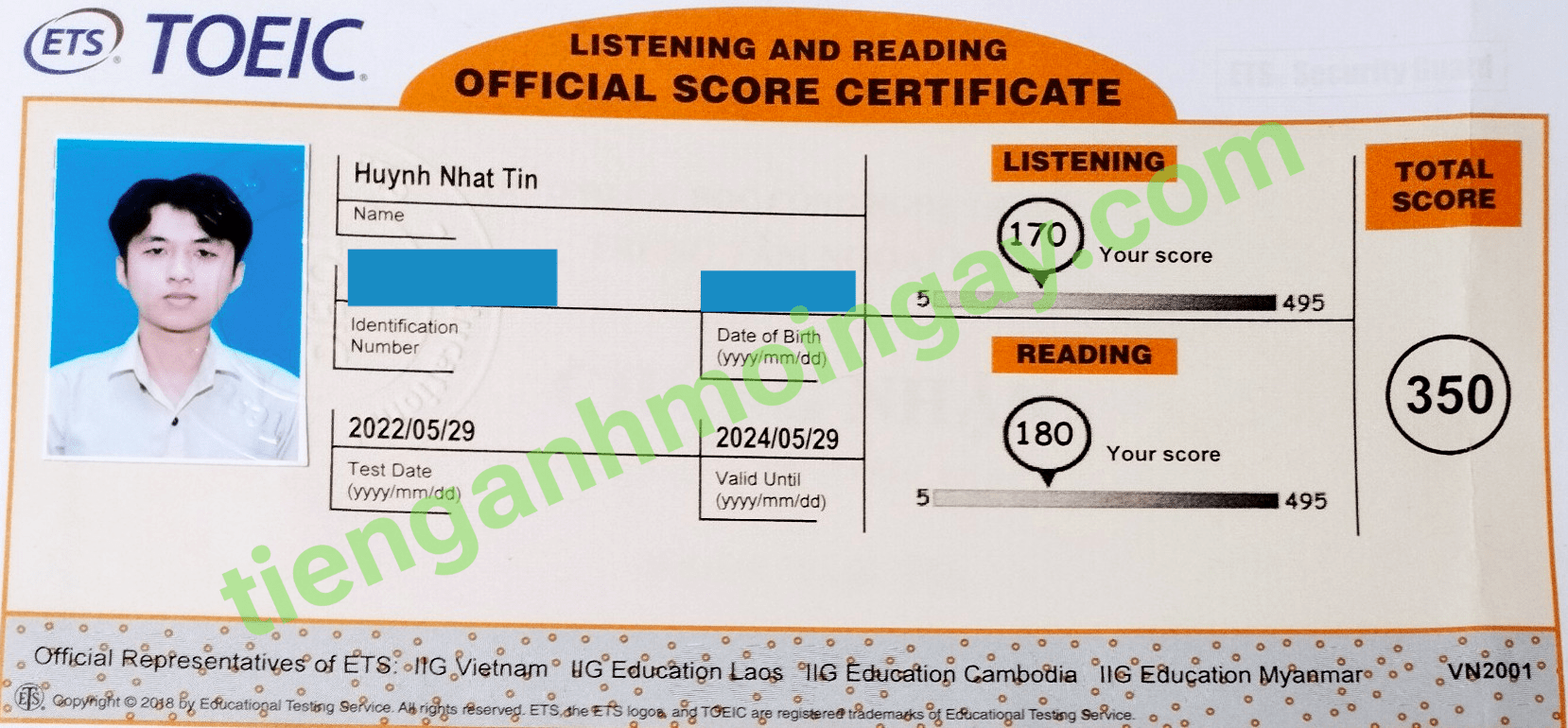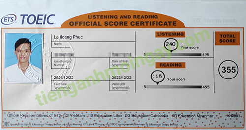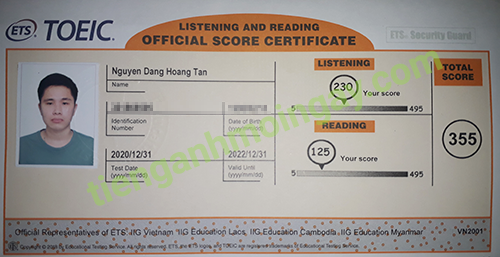 Sau thời gian ôn tập 2 tháng, bạn Tân đã tăng từ 210 điểm và đạt được 355 điểm TOEIC thật.