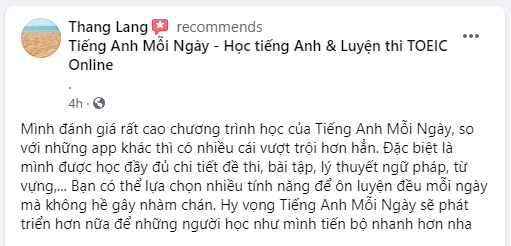 Đội ngũ Tiếng Anh Mỗi Ngày team luôn cố gắng không ngừng nâng cao chất lượng chương trình cũng như dịch vụ để giúp bạn học hiệu quả hơn. Những chia sẻ, nhận xét của các bạn là nguồn động lực và đóng góp quan trọng để Tiếng Anh Mỗi Ngày phát triển như ngày hôm nay.
