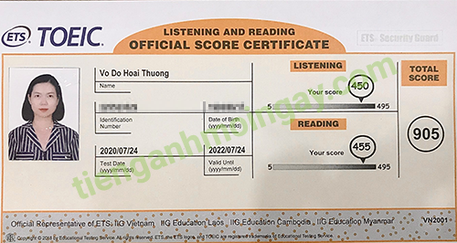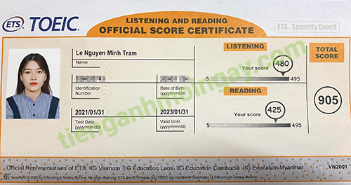 Sau thời gian ôn tập 3 tháng, bạn Trâm đã tăng từ 800 điểm và đạt được 905 điểm TOEIC thật.