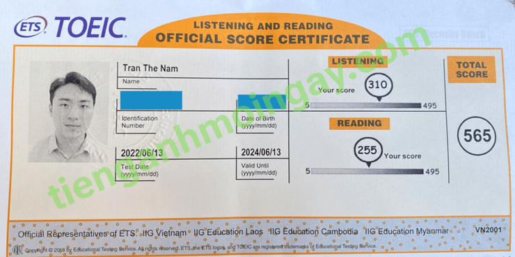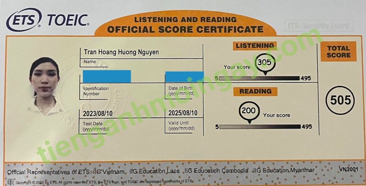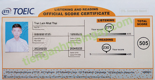 Sau 6 tháng học và luyện thi Toeic cùng TAMN, bạn Nguyên đã thi đạt 505 điểm thi TOEIC thật.