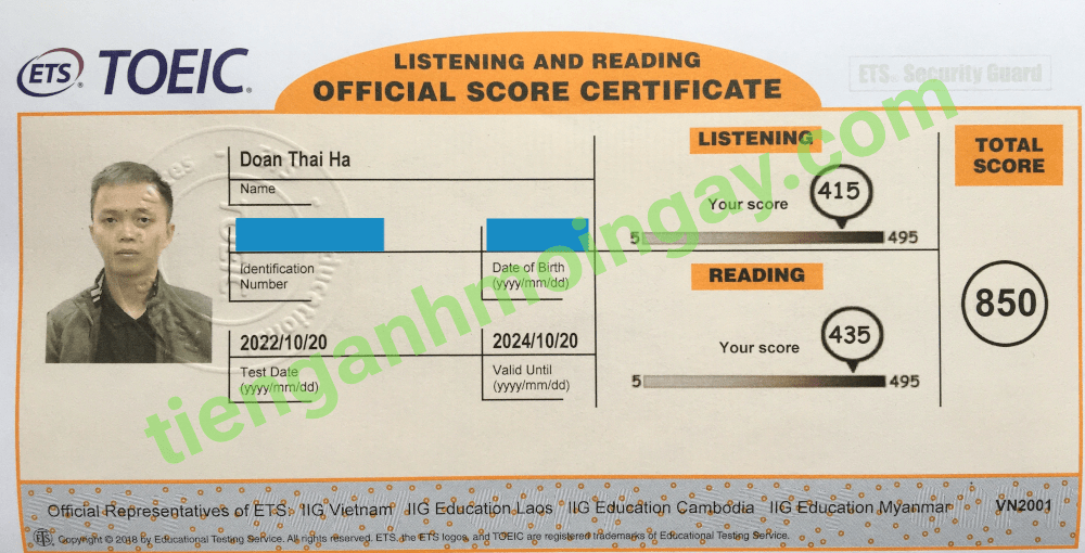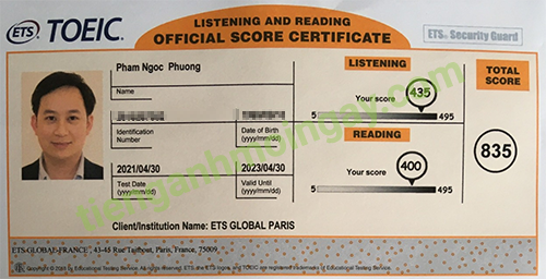 Sau thời gian ôn tập 2 tháng, bạn Thành đã tăng từ 470 điểm và đạt được 835 điểm TOEIC thật.