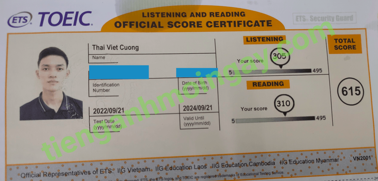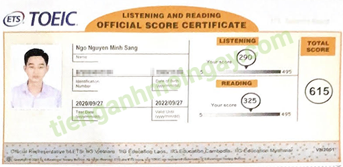 Sau thời gian ôn tập, bạn Sang đã đạt 615 điểm TOEIC thật.