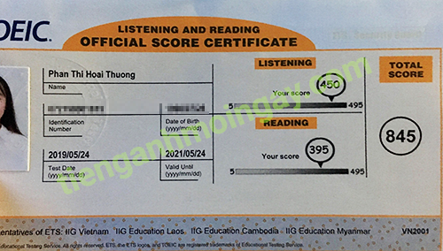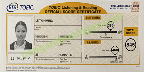 Sau thời gian 1 tháng ôn tập, bạn Thương đã đạt 845 điểm TOEIC thật.