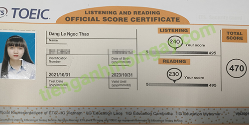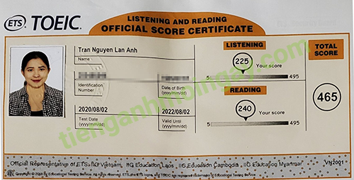 Sau thời gian 1 tháng ôn tập, bạn Lan Anh đã tăng từ 400 điểm và đạt được 465 điểm TOEIC thật.