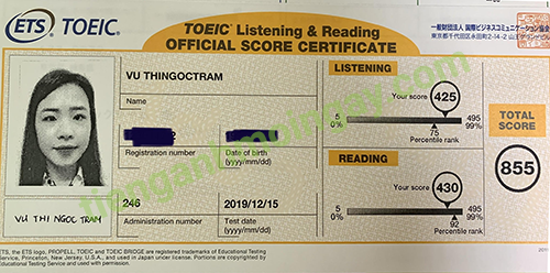 Sau thời gian 3 tháng ôn tập, bạn Trâm đã tăng từ 730 điểm và đạt được 855 điểm TOEIC thật.