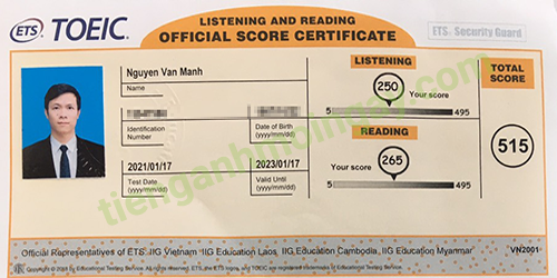Sau thời gian 3 tháng ôn tập trên Tiếng Anh Mỗi Ngày, anh Mạnh đã tăng từ 250 để đạt 515 điểm TOEIC thật.