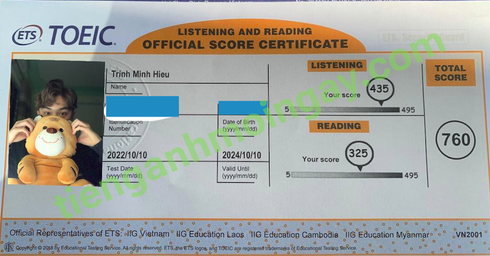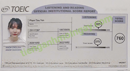 Sau thời gian ôn tập 1 tháng, bạn Yến đã tăng từ 710 điểm và đạt được 760 điểm TOEIC thật.