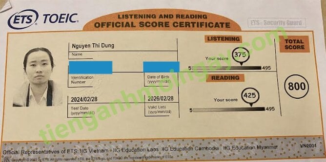 Sau khi học và luyện thi Toeic cùng TAMN, bạn Dung đã thi TOEIC đạt 800 điểm.
