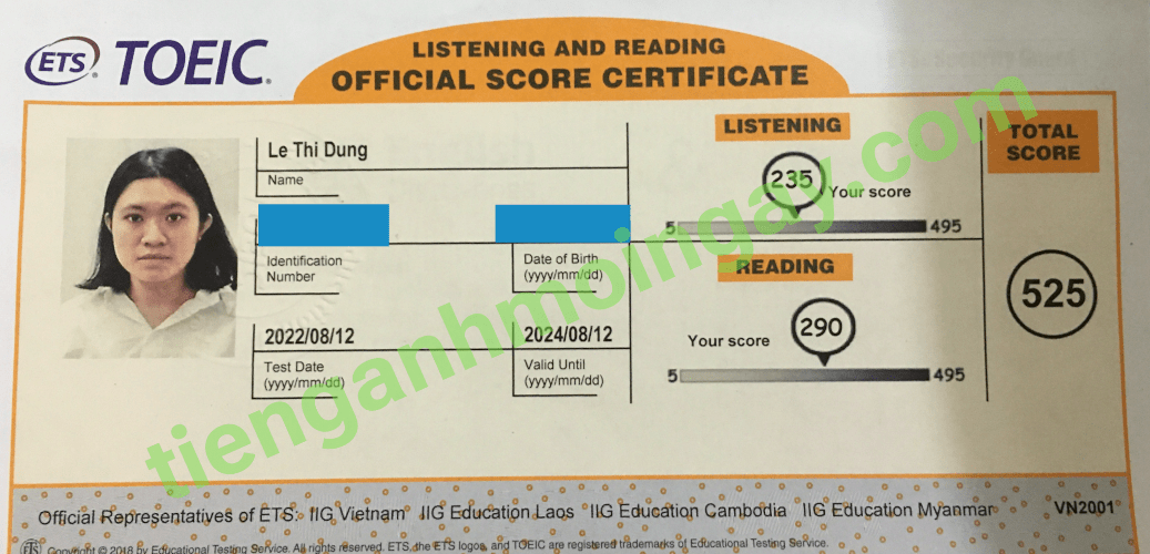 10. Kết quả thi TOEIC của bạn Nguyễn Thị Dung