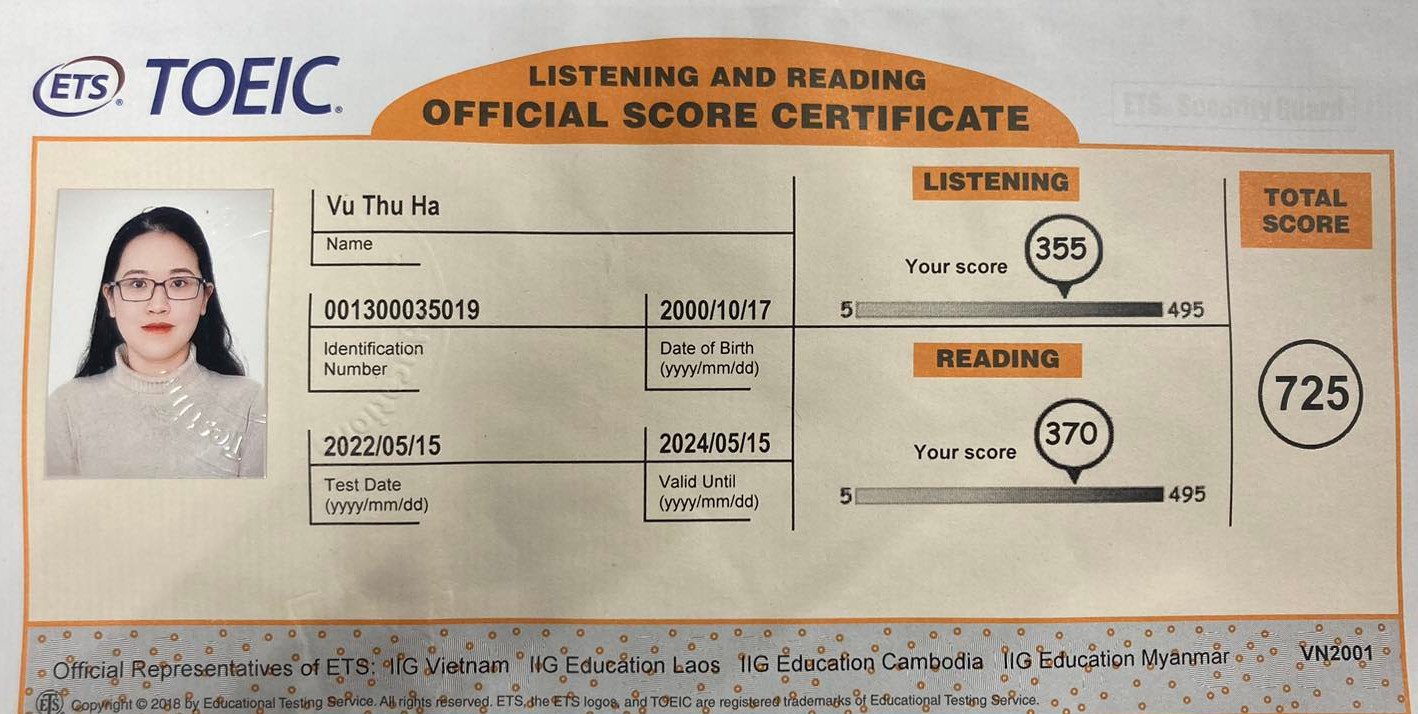 3. Kết quả thi TOEIC của bạn Vũ Thu Hà
