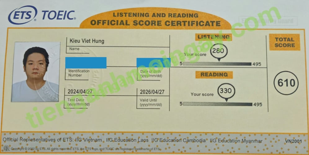 Sau gần 2 tháng học và luyện thi Toeic cùng TAMN, bạn Hưng đã tăng từ 310 điểm đầu vào và thi đạt 610 điểm thi TOEIC thật.