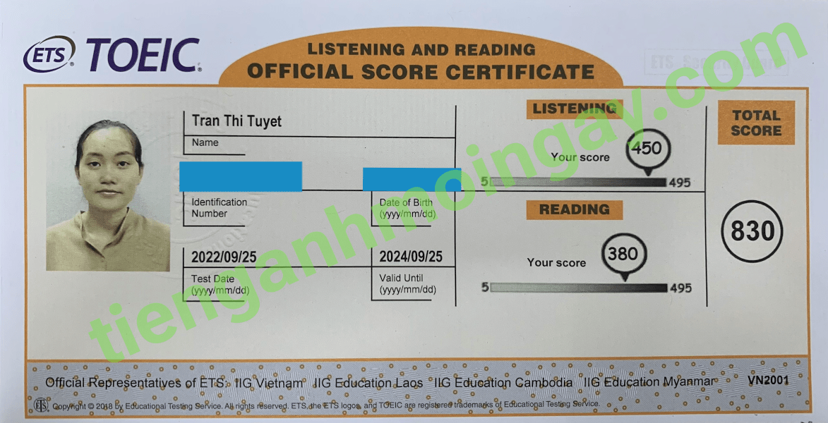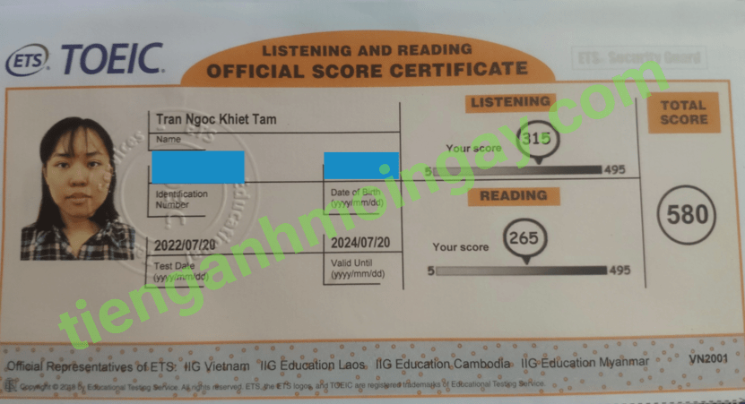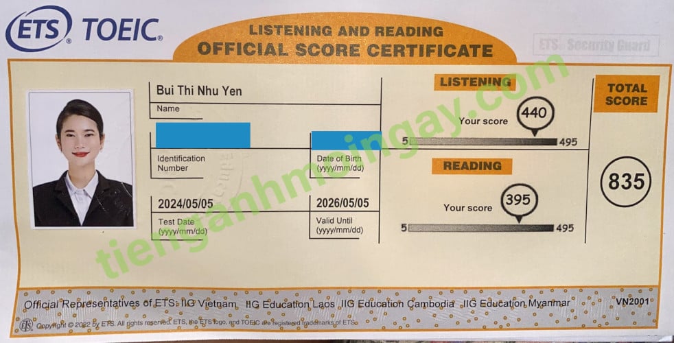 Sau 3 tháng học và luyện thi Toeic cùng TAMN, bạn Yến đã tăng từ 470 điểm đầu vào và thi đạt 835 điểm thi TOEIC thật.