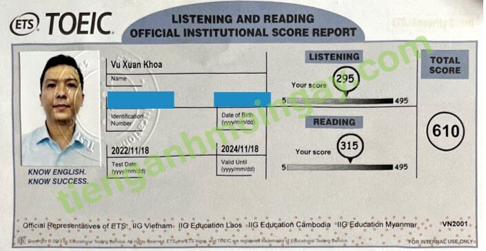 Sau 4 tháng học và luyện thi Toeic cùng TAMN, bạn Khoa đã tăng từ 300 điểm đầu vào và thi đạt 610 điểm thi TOEIC thật.
