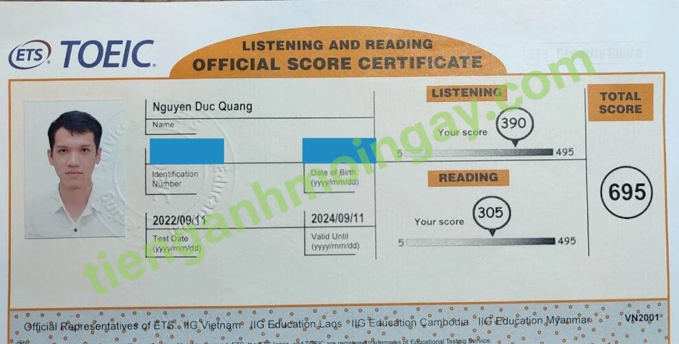 Sau 6 tháng học và luyện thi Toeic cùng TAMN, bạn Quang đã tăng từ 550 điểm đầu vào và thi đạt 695 điểm thi TOEIC thật.