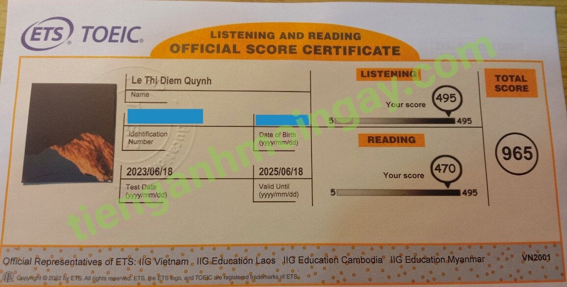 2. Kết quả thi TOEIC của bạn Lê Thị Diễm Quỳnh