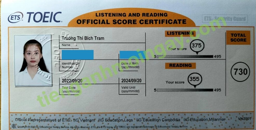 Sau 6 tháng học và luyện thi Toeic cùng TAMN, bạn Trâm đã thi đạt 730 điểm thi TOEIC thật.