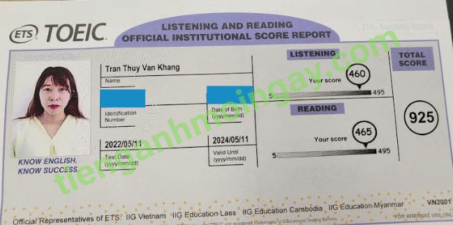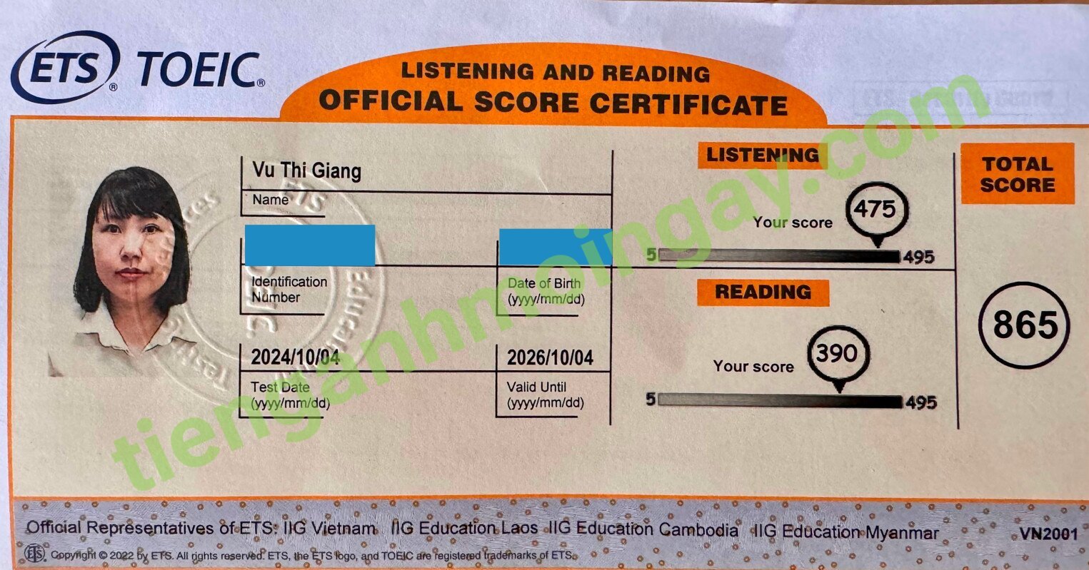Sau 9 tháng học và luyện thi Toeic cùng TAMN, bạn Giang đã thi đạt 865 điểm thi TOEIC. Chúc mừng Giang!