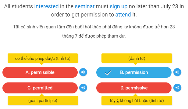 Hãy thử luyện đề một cách khoa học và tiện lợi hơn tại Tiếng Anh Mỗi Ngày, nơi cung cấp hơn 7000 đề luyện tập để bạn thỏa sức rèn luyện. Đặc biệt, tất cả các đề đều được dịch nghĩa và giải thích cách chọn đáp án cho từng câu, giúp bạn nắm vững kiến thức theo từng bước!