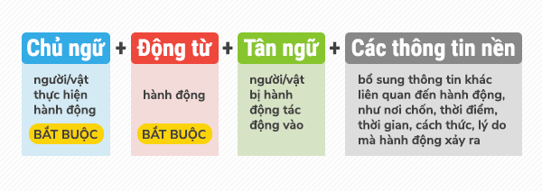 - Các thông tin nền: bổ sung các thông tin khác liên quan đến hành động, ví dụ như nơi chốn, thời điểm, thời gian, cách thức, lý do mà hành động xảy ra. Các thông tin nền có thể có, có thể không có; nếu có sẽ làm rõ ý nghĩa của câu hơn, còn nếu không có cũng không ảnh hưởng đến câu về mặt ngữ pháp.