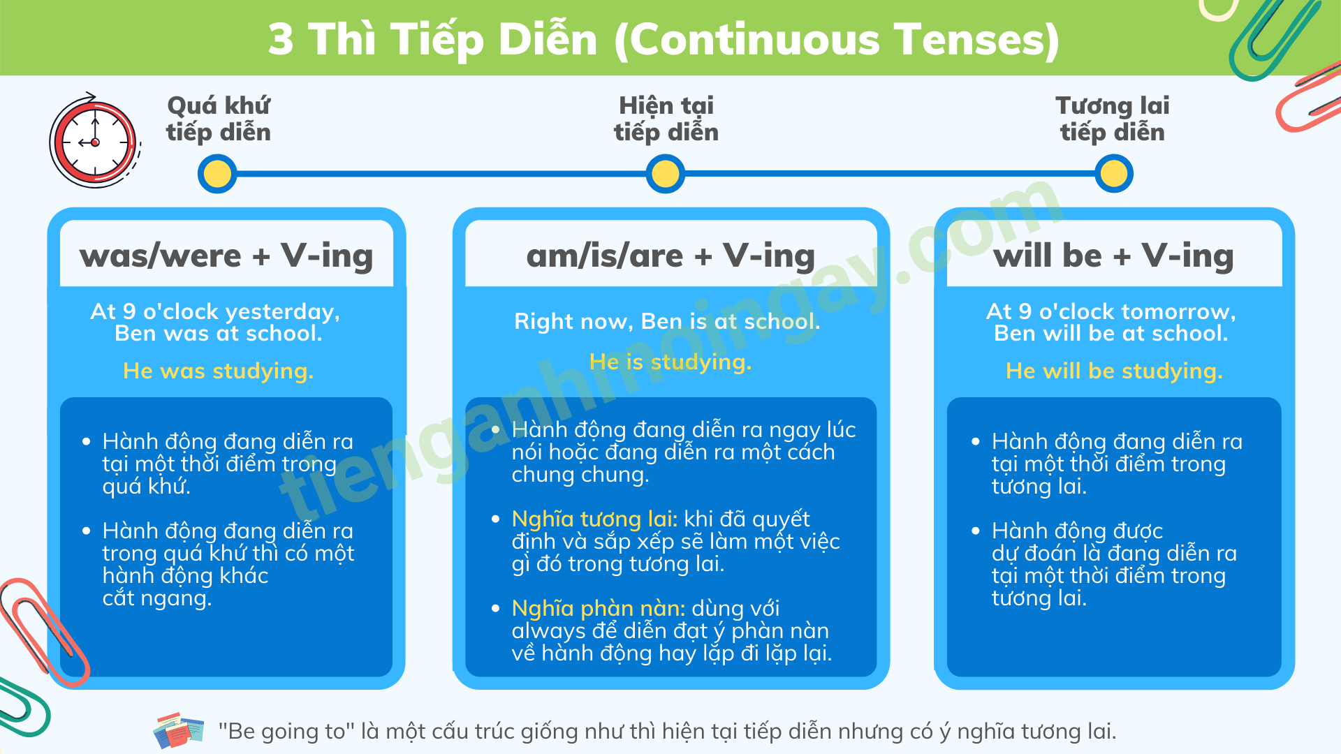 Bài học này sẽ đi vào chi tiết về 3 thì động từ trong tiếng Anh: Thì Hiện Tại Tiếp Diễn, Thì Quá Khứ Tiếp Diễn, Thì Tương Lai Tiếp Diễn.