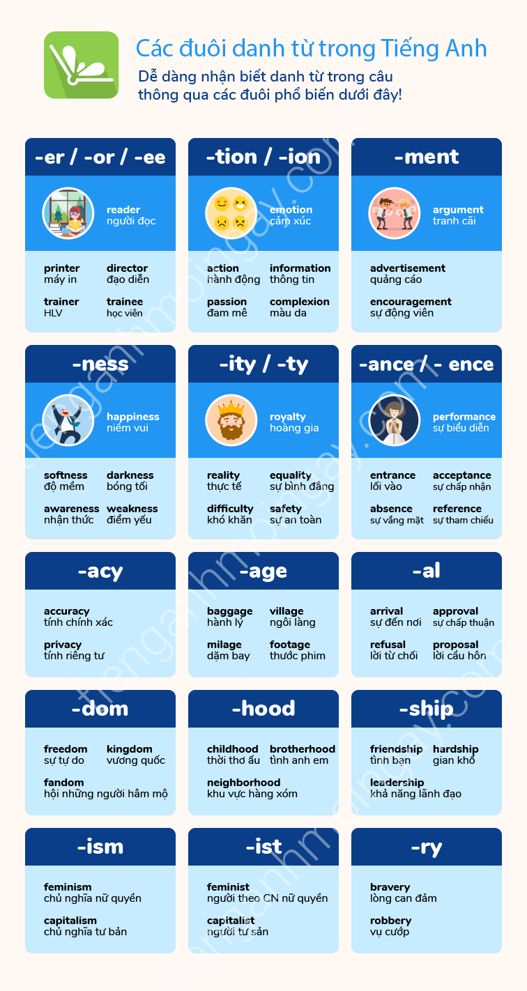 Các đuôi thông dụng sau đây sẽ giúp bạn nhận ra từ nào là danh từ trong tiếng Anh. Tuy nhiên, bạn cũng cần lưu ý là vẫn có một số ít trường hợp ngoại lệ dù có những đuôi này nhưng không phải là danh từ.