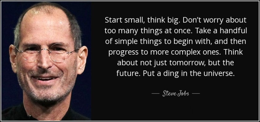 Ta cũng có thể học từ câu nói của Steve Jobs: “Start small, think big..." Dù việc đầu tiên bạn làm để thực hiện mục tiêu có nhỏ đi nữa thì đó vẫn là một bước tiến triển, còn hơn là không làm gì.