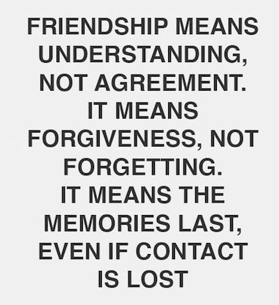"Friendship means understanding, not agreement. It means forgiveness, not forgetting. It means the memories last, even if contact is lost."
