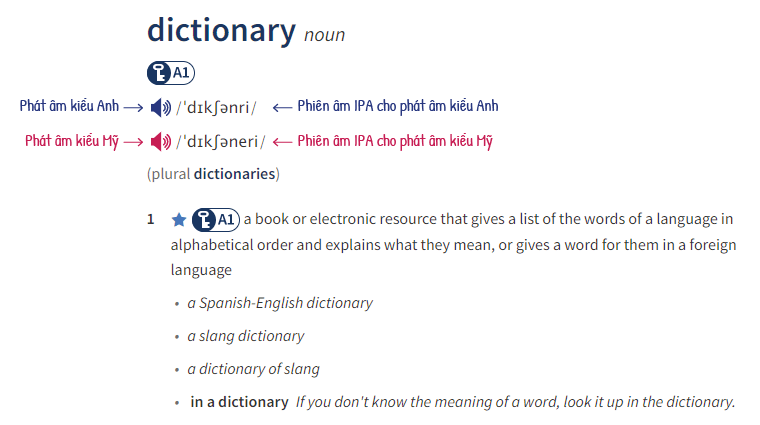 Khi nhấp vào biểu tượng cái loa xanh và cái loa đỏ, bạn sẽ nghe được cách phát âm bản xứ theo kiểu Anh và kiểu Mỹ của từ dictionary . Ta thấy âm tiết đầu tiên của từ được phát âm cao, còn những âm tiết còn lại được phát âm thấp, nên ta biết từ dictionary có trọng âm là âm tiết đầu tiên.