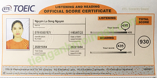Dưới đây là bảng điểm kết quả thi TOEIC đạt điểm mong đợi của Song Nguyên.