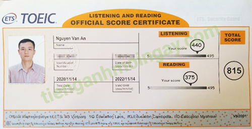 Dưới đây là bảng điểm kết quả thi TOEIC đạt điểm mong đợi của anh An.