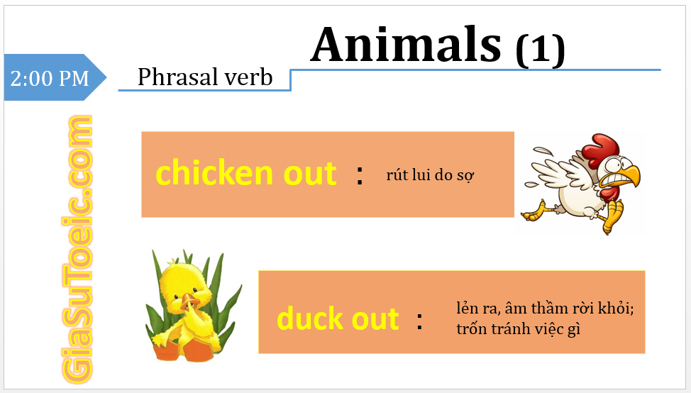 1/ chicken out: rút lui, không dám làm việc gì đó