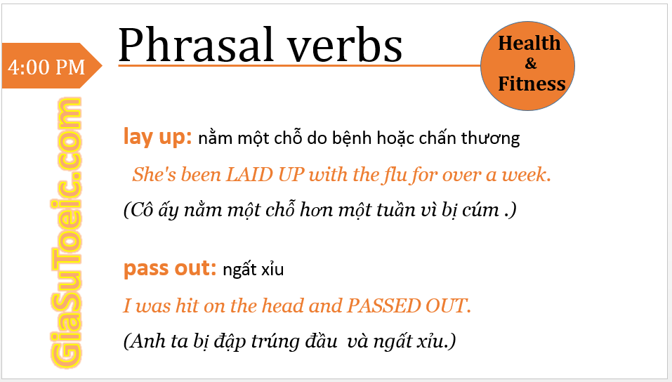 Luyện thi TOEIC Từ vựng TOEIC Bài này Phrasal verb theo chủ đề: Sức khỏe (3) Với những bài học dễ hiểu, sát thực tế, Tiếng Anh Mỗi Ngày giúp bạn từng bước tự tin sử dụng tiếng Anh và chinh phục kỳ thi TOEIC. Khám phá tiềm năng của bạn - Đăng ký ngay!Bắt đầu hôm nay với tài khoản học thử miễn phí – bước đầu tiên để bứt phá kỹ năng tiếng Anh và chinh phục mục tiêu TOEIC của bạn. Đăng ký bằng Facebook hoặc ⯈ Đăng ký bằng email Viết câu hỏi, thắc mắc của bạn về bài viết Tìm kiếm bài học bạn đang quan tâm Tham khảo thêm những bài viết về những chủ đề tương tự 1400+ từ vựng TOEIC hay gặp nhất trong các đề thi TOEIC Trang bị từ vựng khi xin việc vào các doanh nghiệp nước ngoài. Phân biệt "from" và "form" Phrasal verb theo chủ đề: Động vật (5) Phân biệt "later" và "latter" Phrasal verb theo chủ đề: Động vật (4) Xem tất cả các bài viết về Từ vựng TOEIC