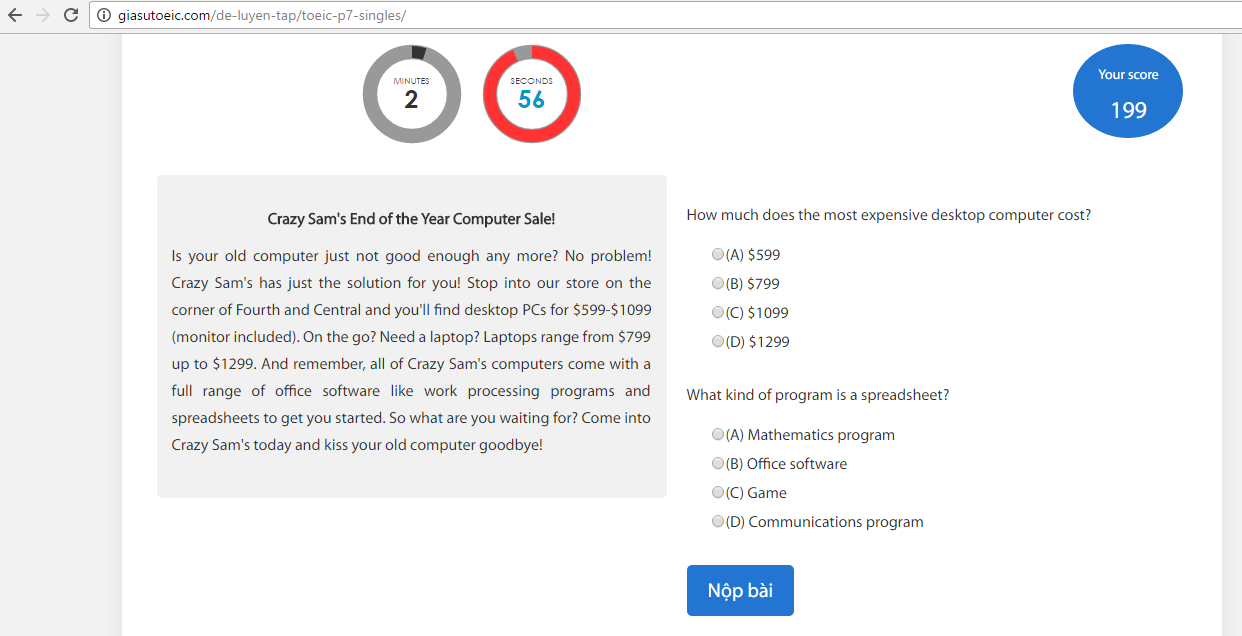 Trang làm bài được chia làm đôi, bên trái là đoạn văn, bên phải là phần chọn câu trả lời. Từ nay mọi người không cần phải kéo lên kéo xuống khi chọn đáp án nữa