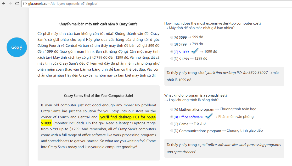 Trang xem lại câu trả lời cũng được chia làm hai phần tương tự như trên. Ngoài ra, các bạn còn có thể kích chuột trực tiếp vào phần giải thích để xem câu giải thích đó nằm ở đâu trong đoạn văn đề bài nữa!