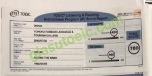 Sau 9 tháng ôn tập trên Tiếng Anh Mỗi Ngày, bạn Danh đã đạt được 780 điểm TOEIC thật. Bạn Danh là học viên ở nước ngoài của Tiếng Anh Mỗi Ngày và thi TOEIC tại Nhật nhé.