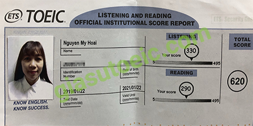 Sau 4 tháng ôn tập trên Tiếng Anh Mỗi Ngày, chị Hoài đã tăng từ 400 điểm ban đầu để đạt được 620 điểm TOEIC thật. Hiện tại chị vẫn đang tiếp tục học trên Tiếng anh Mỗi ngày để nâng cao điểm số của mình.