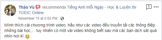 Đây là review tiêu biểu trên Tiếng Anh Mỗi Ngày Fanpage tuần vừa rồi: