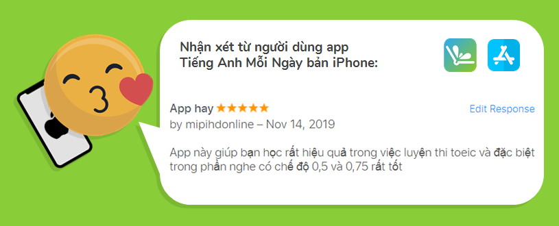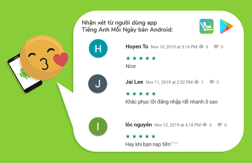 Tiếng Anh Mỗi Ngày đã nhận được rất nhiều đánh giá tốt trên App Android và iOS tuần vừa qua và xin chia sẻ với bạn các đánh giá tiêu biểu nhất nhé: