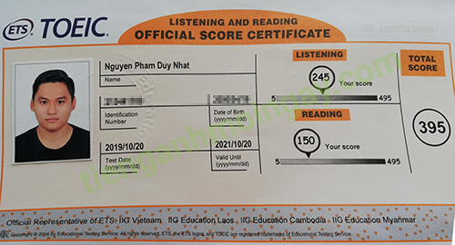 Mr. Nguyễn Phạm Duy Nhật đã đạt 395 điểm TOEIC ngày 20/10/2019