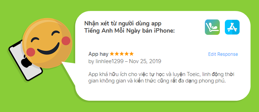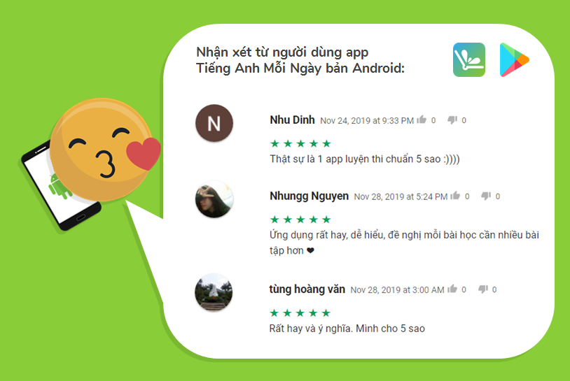 Tiếng Anh Mỗi Ngày đã nhận được rất nhiều đánh giá tốt trên App Android và iOS tuần vừa qua và xin chia sẻ với bạn các đánh giá tiêu biểu nhất nhé: