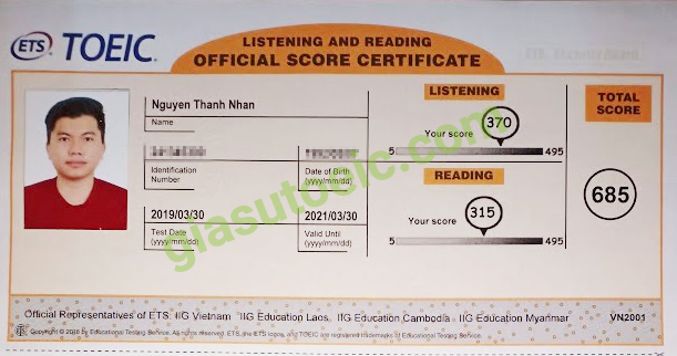 Sau 3 tháng ôn tập, anh Thành Nhân đã tăng từ 500 điểm lên 685 điểm TOEIC như mong đợi. Hiện tại anh vẫn đang tiếp tục đăng ký khóa học để cải thiện điểm trên Tiếng anh Mỗi ngày với mục tiêu cao hơn nữa nha.