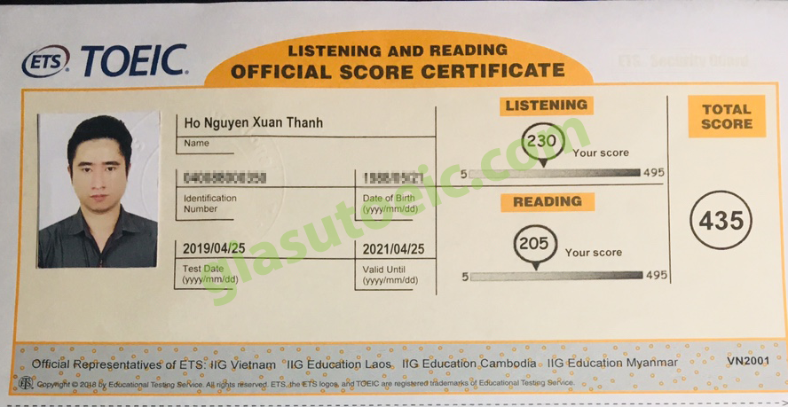 Sau thời gian ôn tập trên Tiếng anh Mỗi ngày, anh Xuân Thanh đã tăng từ 330 điểm TOEIC lên 435 điểm TOEIC. Hiện anh vẫn đang tiếp tục đăng ký khóa học để cải thiện điểm trên Tiếng anh Mỗi ngày.